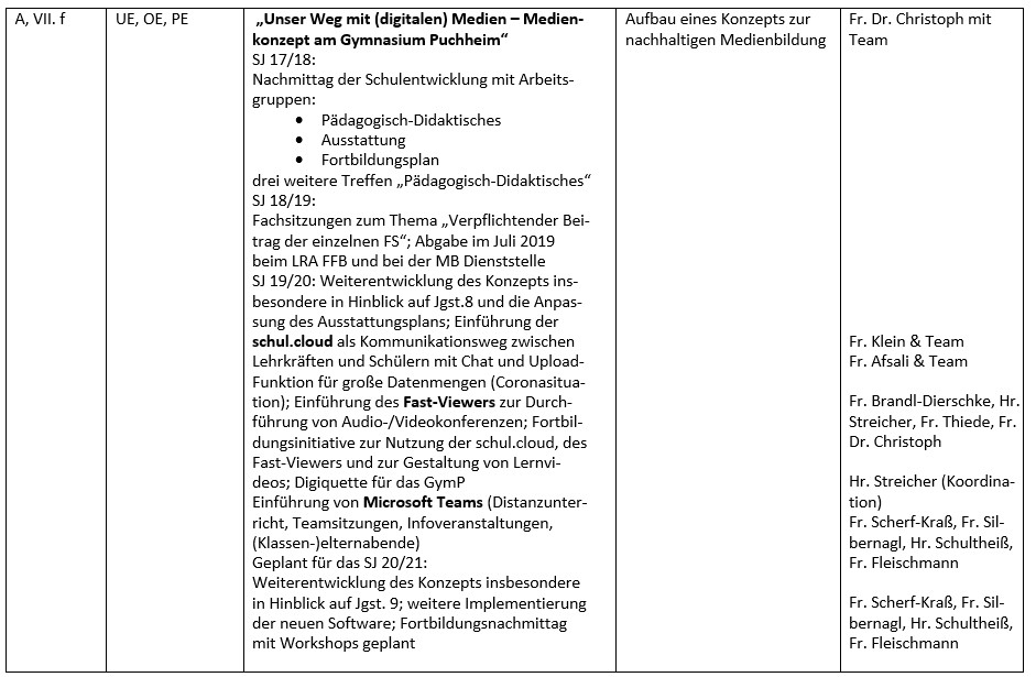 Die Angaben in der 1. Spalte beziehen sich auf die jeweiligen Aspekte im Konzept Partnerschaft Kind-Elternhaus-Schule (siehe auch Graphik rechts) und die Angaben in der zweiten Spalte auf die Entwicklungsbereiche Unterricht (UE), Organisation (OE) bzw. Personal (PE).