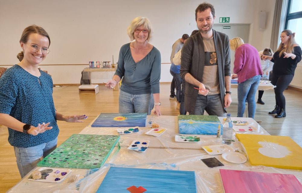 Mit dem Modewort der Resilienz befassten sich am diesjährigen Lehrkräfteeinkehrtag 16 Lehrkräfte des Gymnasiums Puchheim. Üblicherweise werden sieben Faktoren für Resilienz genannt, an diesem Fortbildungstag sollten drei genauer in den Blick genommen werden: Optimismus, Selbstwirksamkeit und Entspannung. Die Referenten Max Altmann und Elisabeth Thiede, beide Beauftragte für Schulpastoral, leiteten dies an. In außerschulischer Atmosphäre im Pfarrzentrum St. Johann Baptist in Gröbenzell verknüpften die Lehrerinnen und Lehrer ihre Gedanken mit kreativem Tun. Viele empfanden schon diese Abwechslung als Entspannung! Unterstützt wurden sie dabei vom Künstler Martin Becker aus Fürstenfeldbruck. Die entstandenen Bilder wurden mit nach Hause genommen und sind für die Teilnehmerinnen und Teilnehmer erfahrungsgemäß für lange Zeit ein Anker im stressigen Alltag.